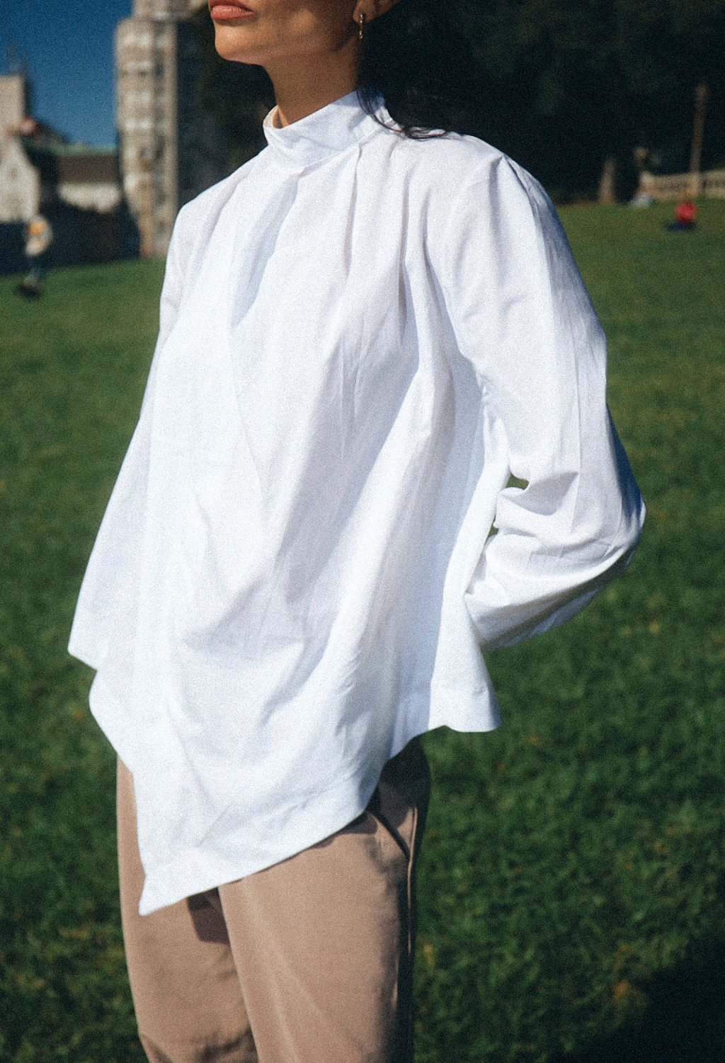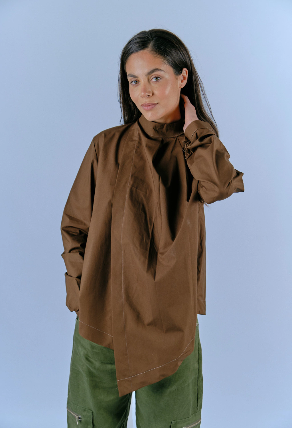 Camisa de diseño confeccionada en poplin 100% algodón. Cuello alto, que podes ajustar a tu medida. Manga larga, pico en el frente, y atras clasica. El cruce de la camisa genera un pliegue en el frente que le da ese toque original.