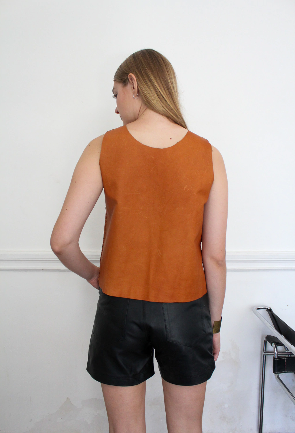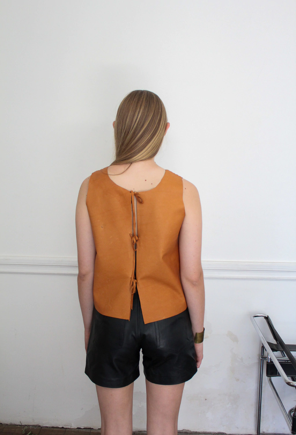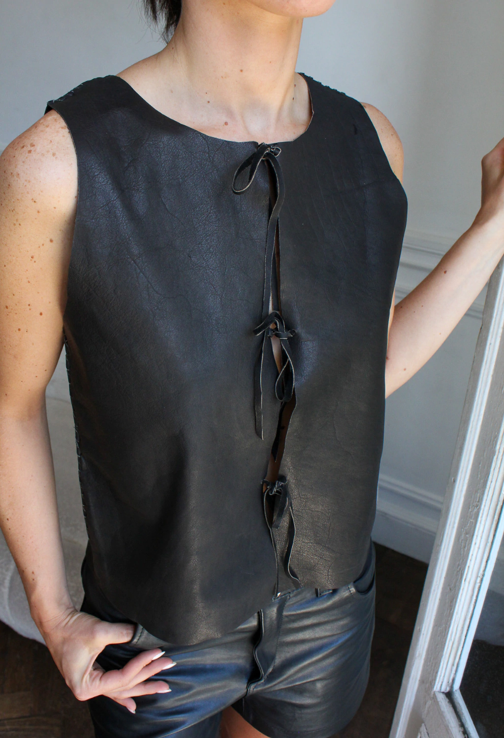 Top de cuero con 3 lazos para atar, con costuras a los costados y en los hombros. Lo podes usar tanto con los lazos para adelante como para atras, con algo abajo o sin!