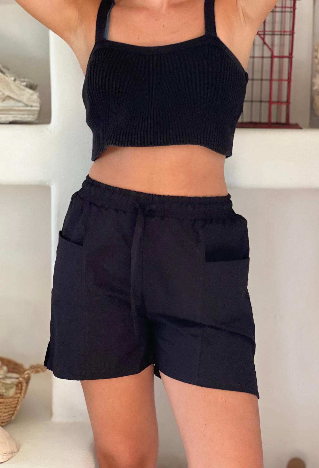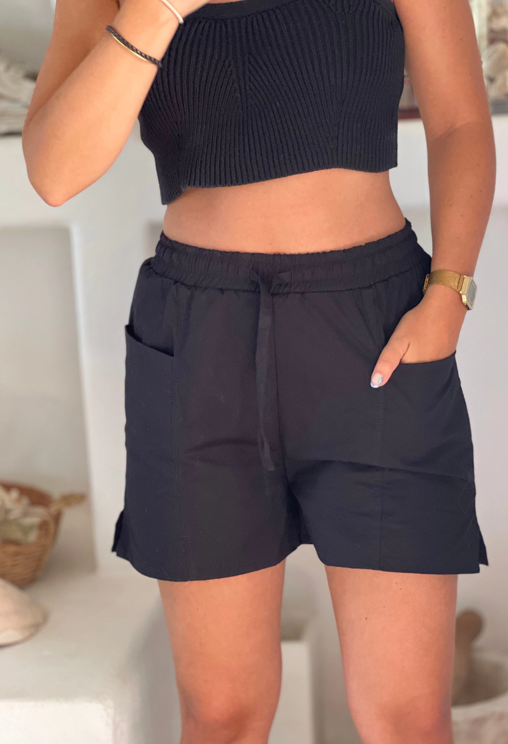 Short bermuda confeccionada en poplin pantalonero de algodón. Con recortes de diseño en el frente y en el dorso, bolsillos incorporados en el frente, cintura con elastico y tiras de ajuste.