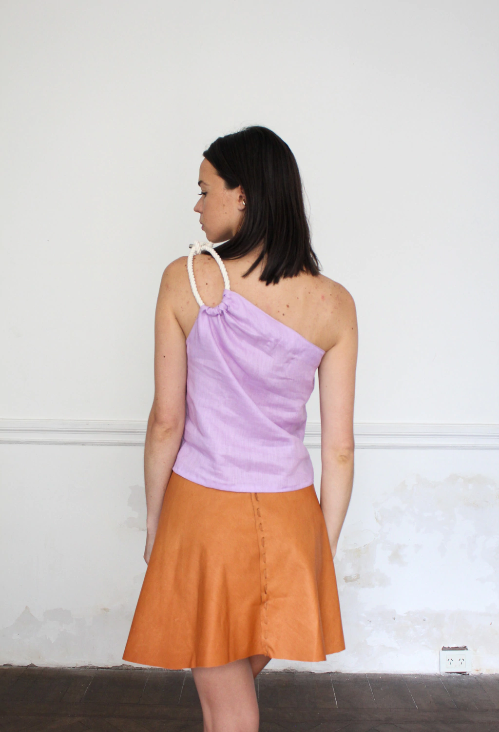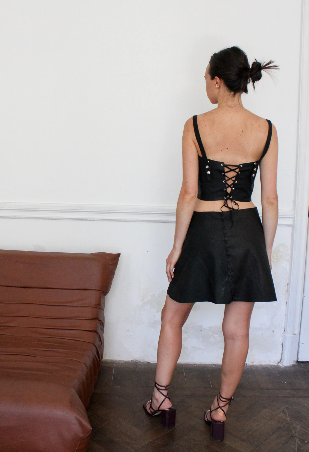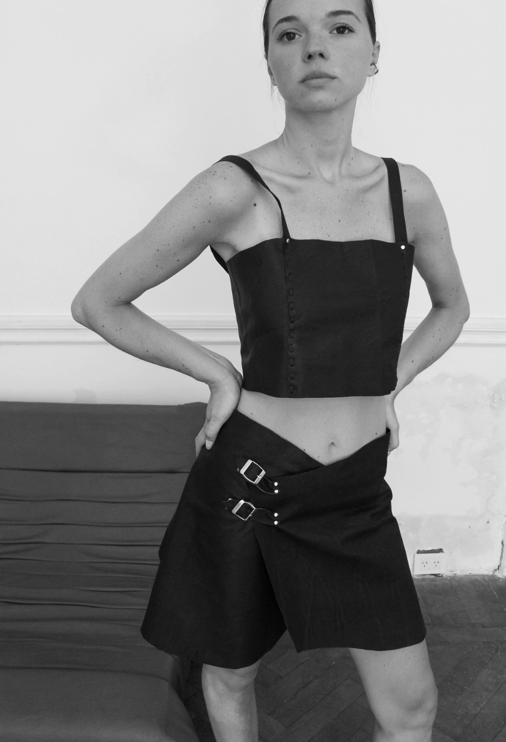 Pollera tipo mini de cuero, formato "portafolio", que se cierra con 2 hebillas para que lo regules a tu gusto.