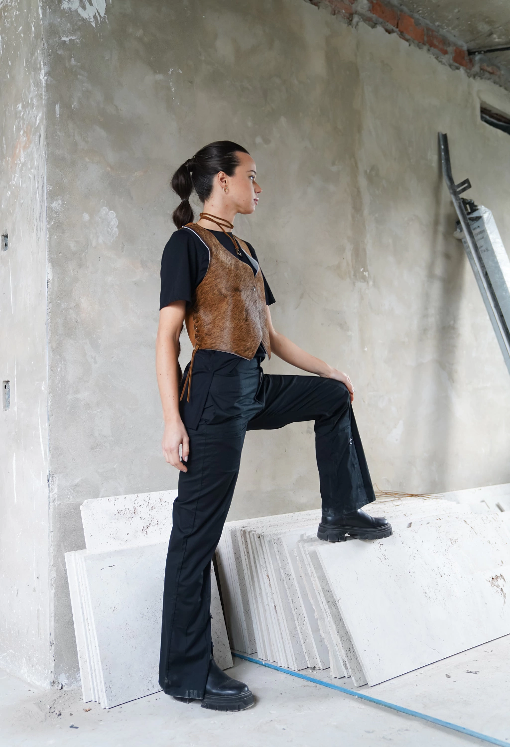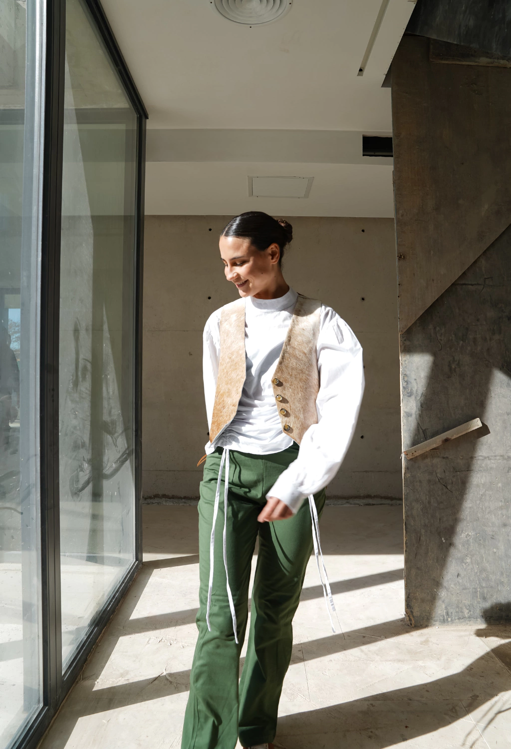 Chaleco sastrero de cuero argentino, 100% hecho a mano. El cuero del frente es piel, y su color varia ya que es un producto natural. Algunos son mas claros, otros mas oscuros. El dorso esta realizado en cuero gamuzado en color suela. Tiene 4 botones carey en el frente y podes usarlo abierto o cerrado. ¡Una prenda que te durará para siempre!