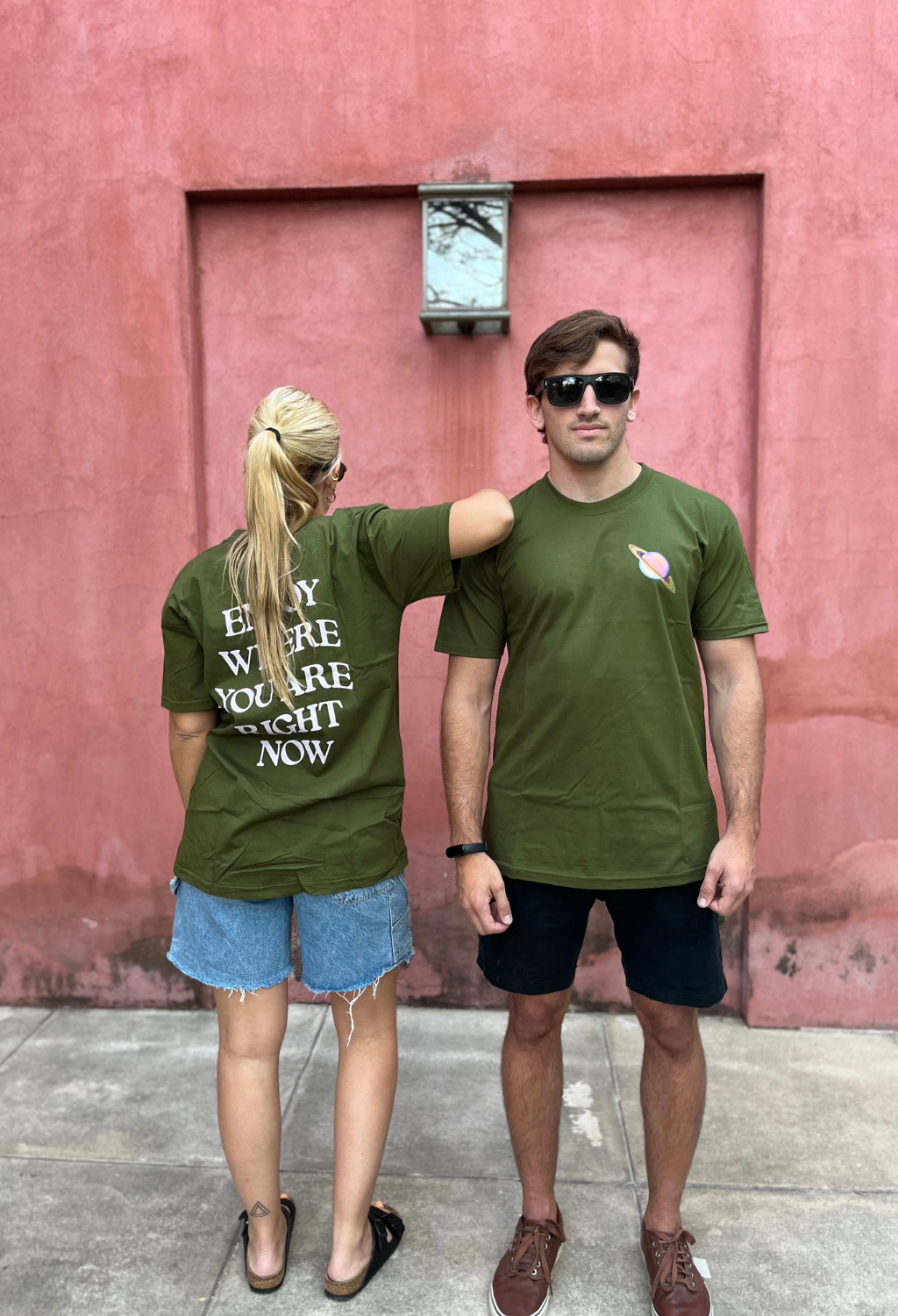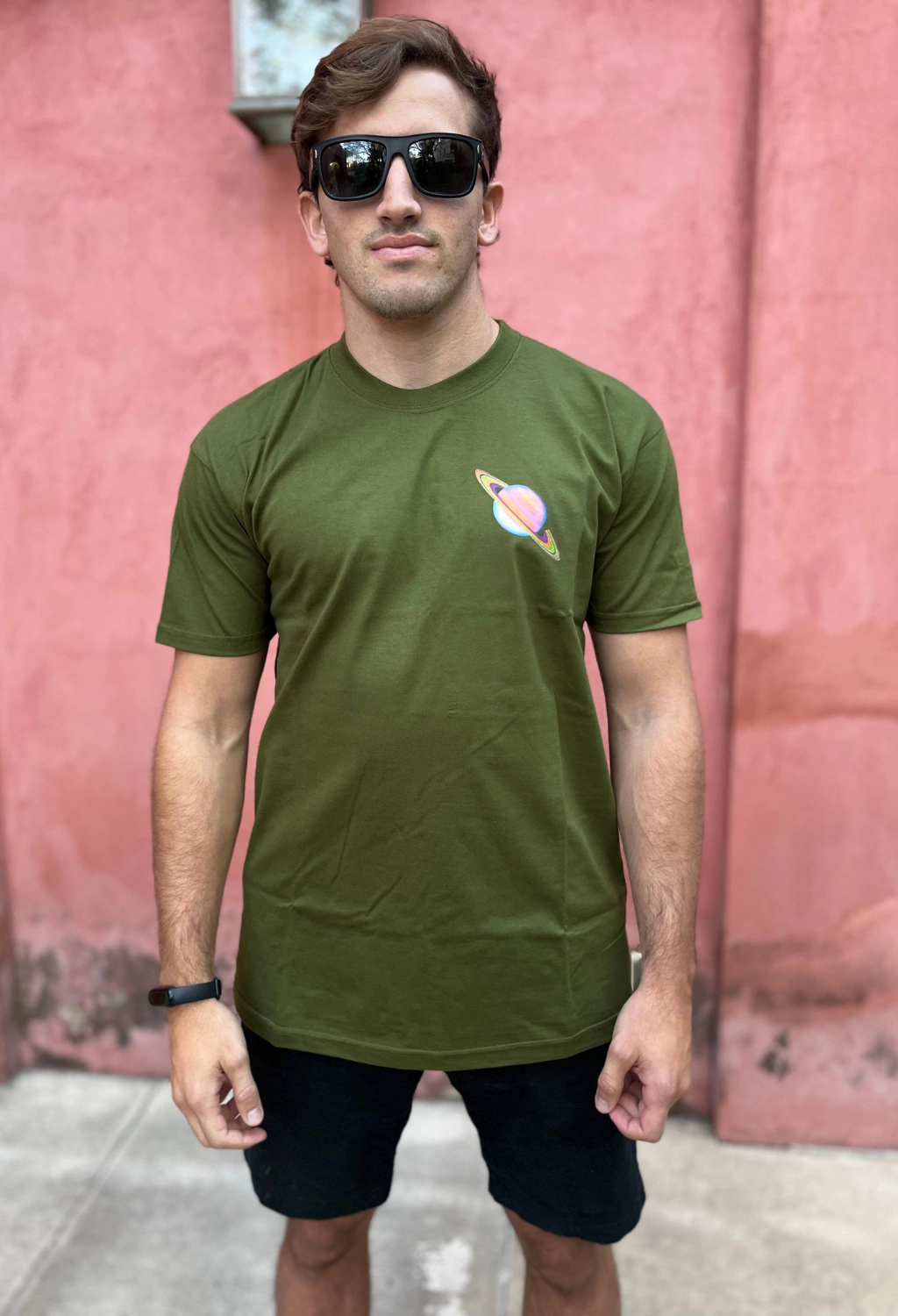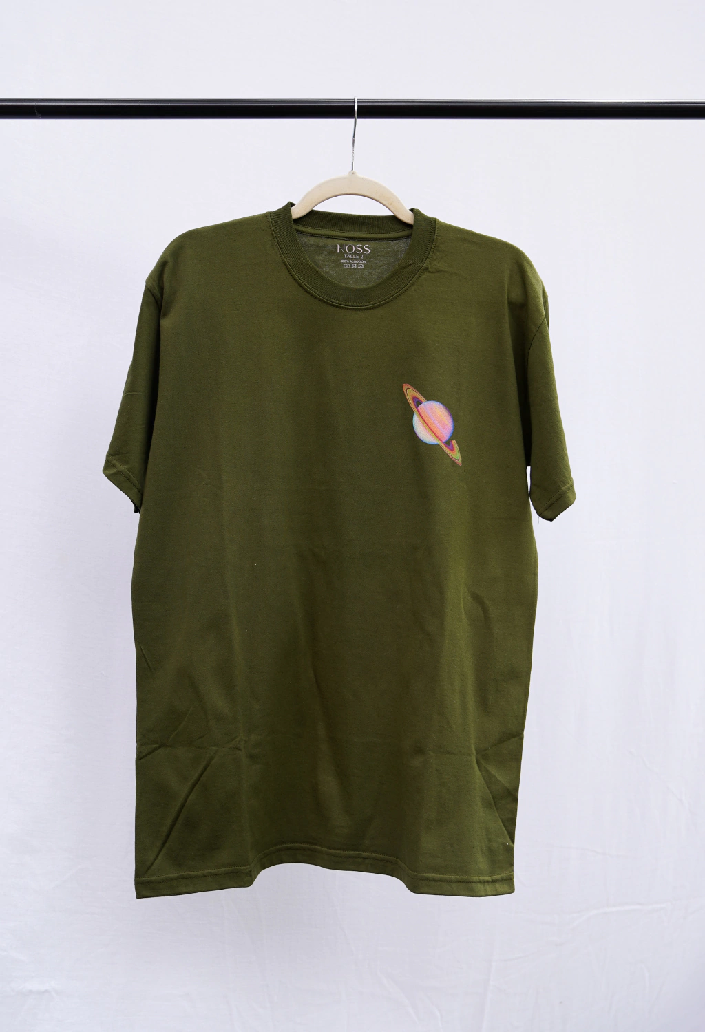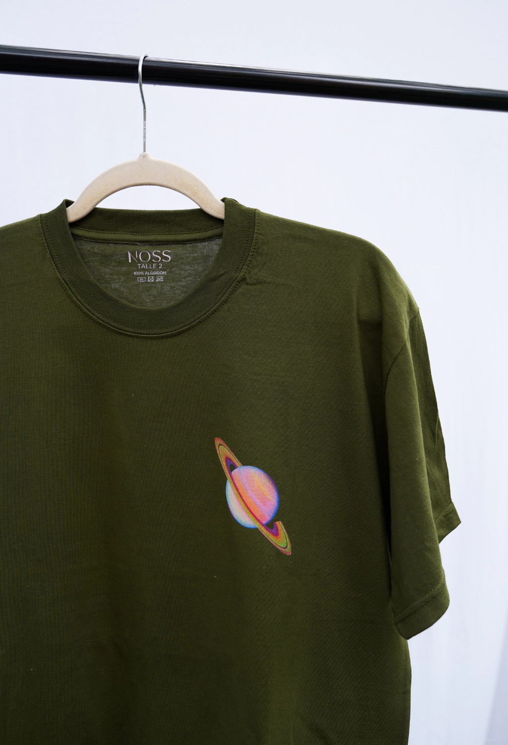 Remerón unisex manga corta y cuello redondo, confeccionada 100% en algodón con estampa de planeta en el frente y frase en el dorso.