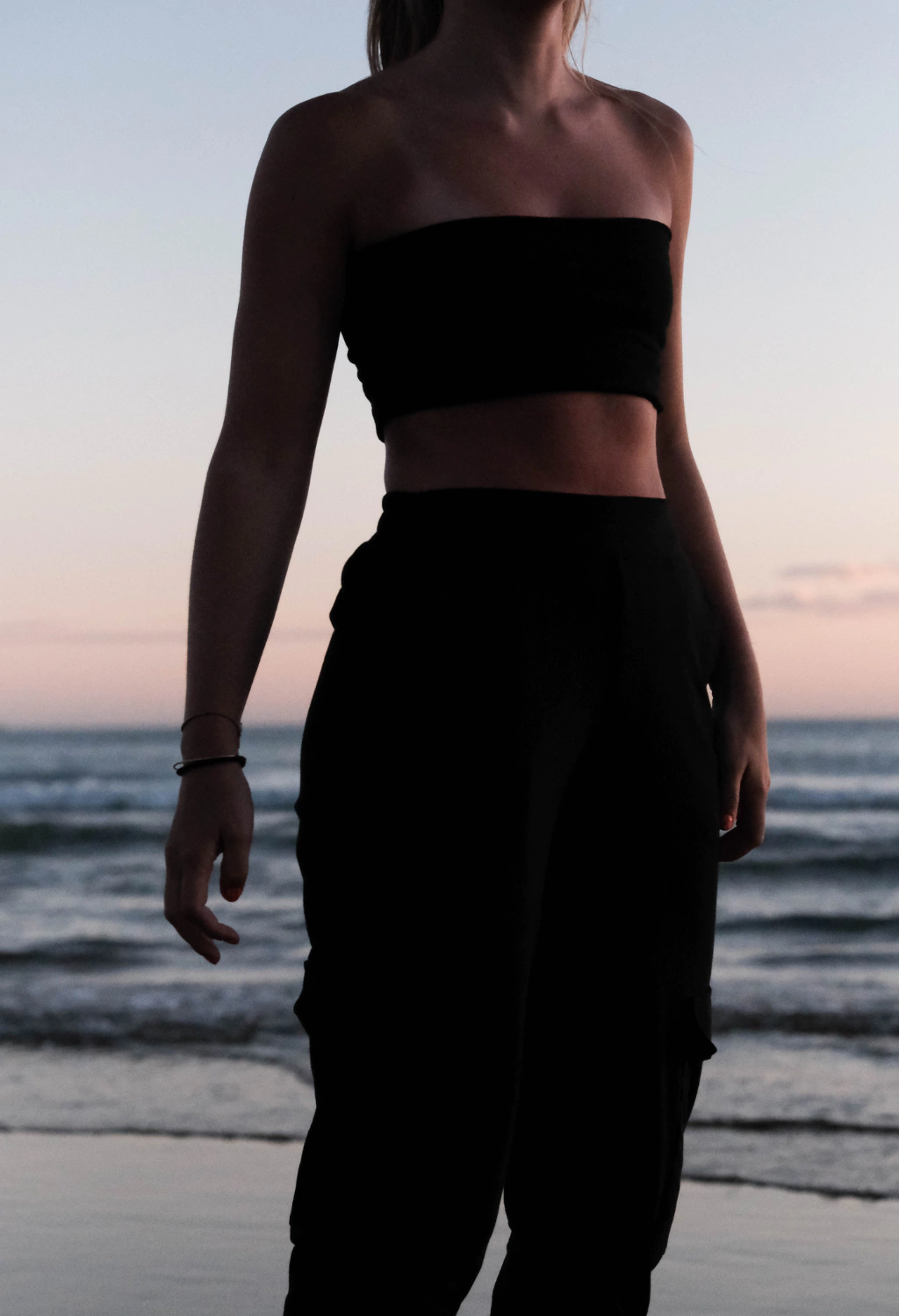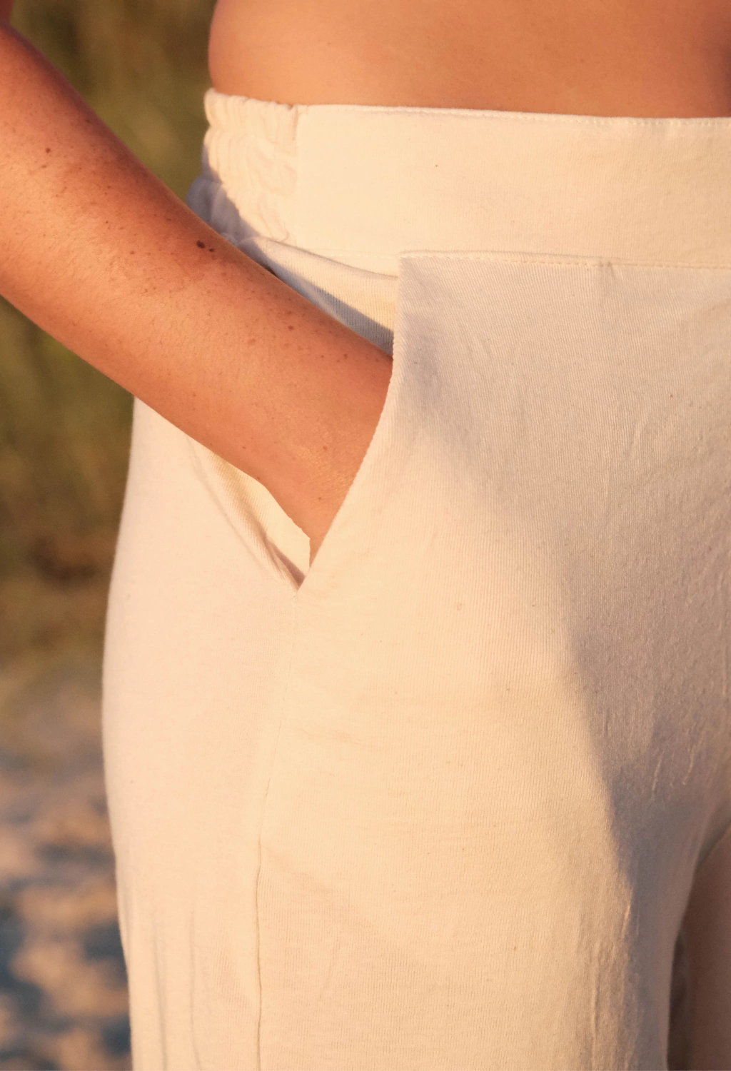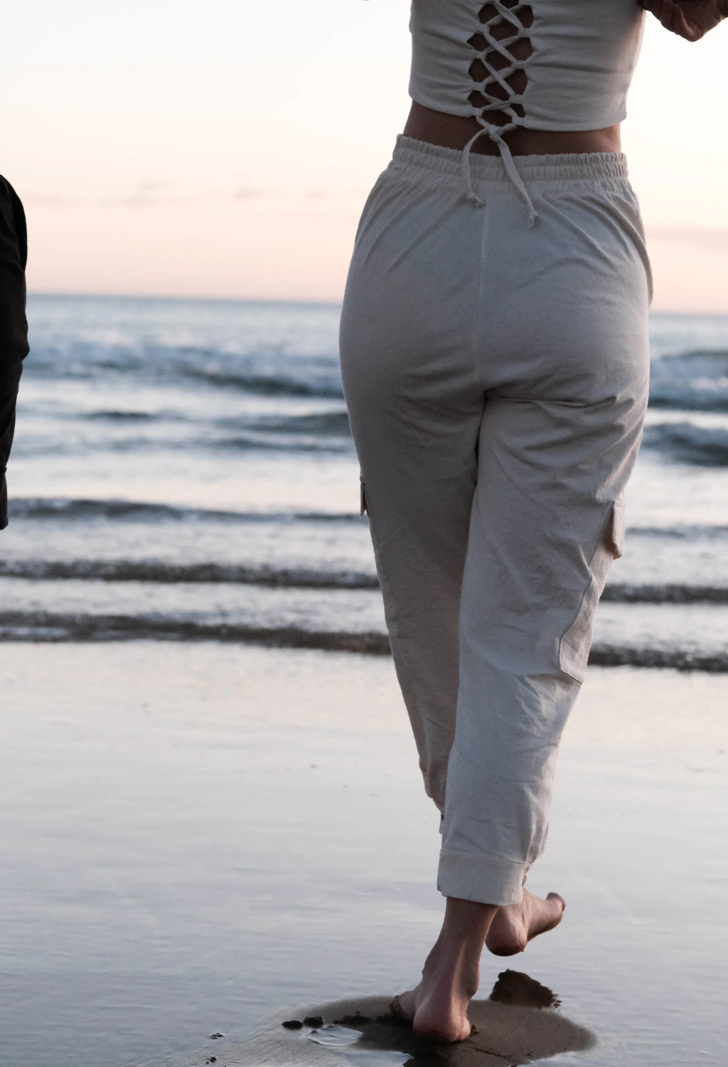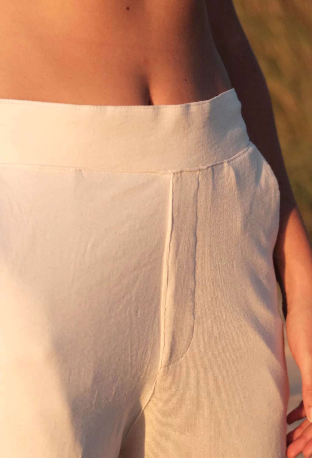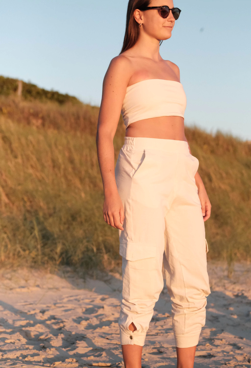 Babucha confeccionada 100% en algodón natural. En la cintura tiene un elástico que la hace muy versatil, bolsillos tipo cargo a los costados y botón en el tobillo. Podes usarla arremangada o normal.