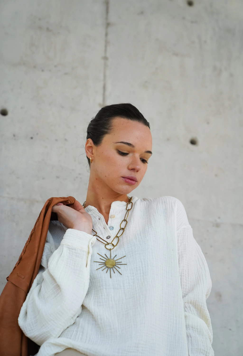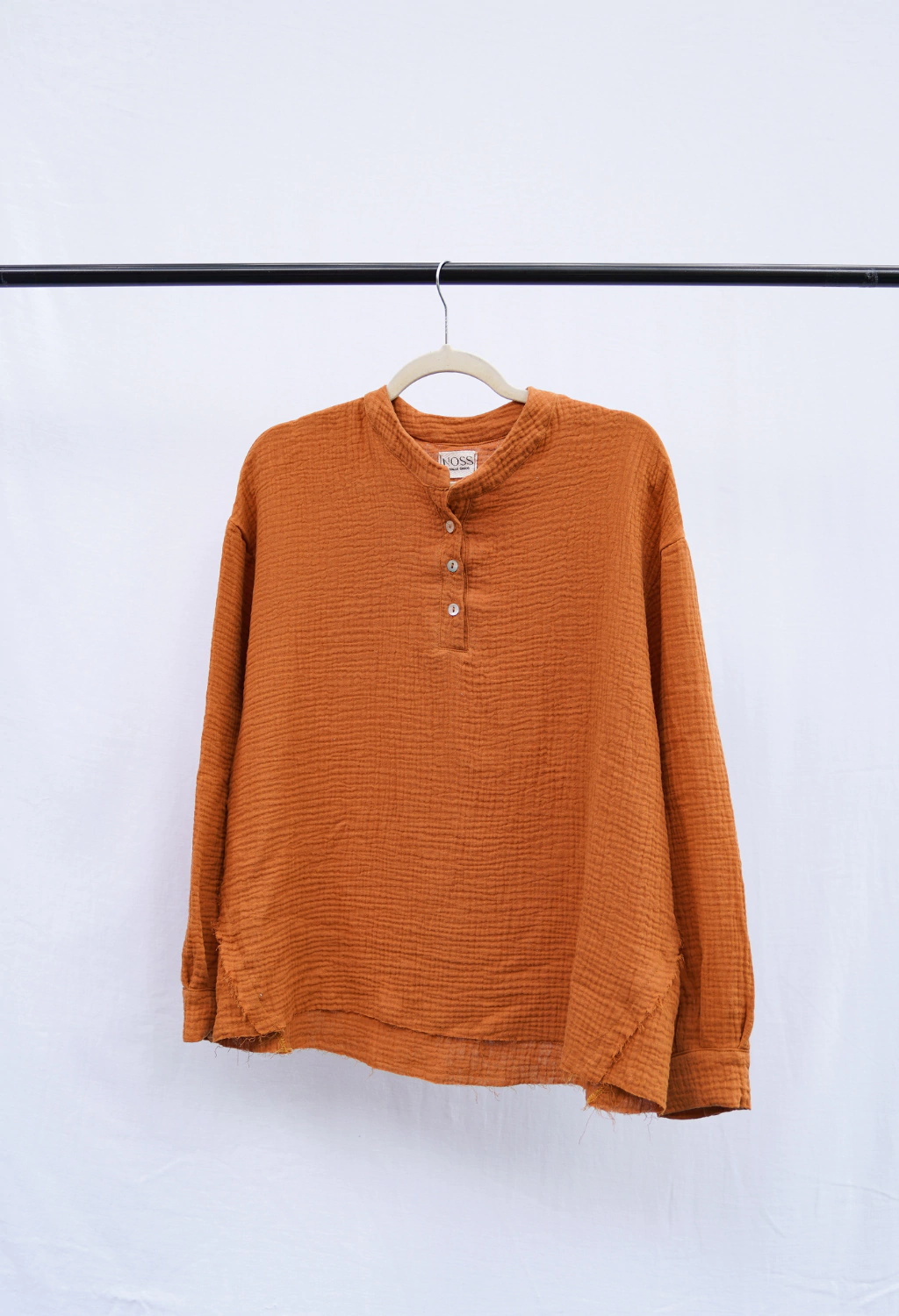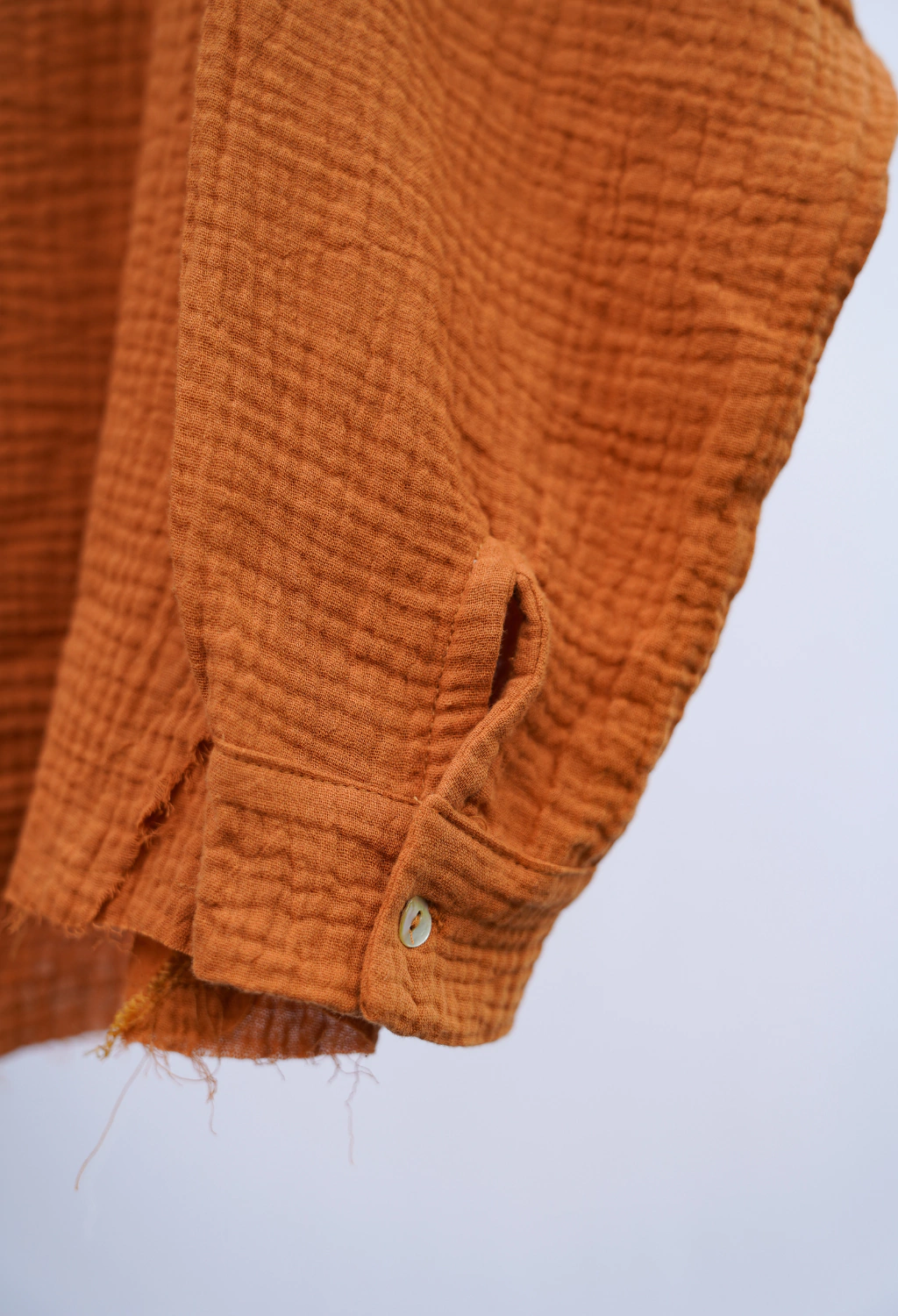 Cuenta con 3 botones de nacar hasta el centro de la camisa, botones de nacar en los puños. Corte irregular de diseño a los costados, y desflecado al final de la camisa. Ideal para cualquier epoca del año!