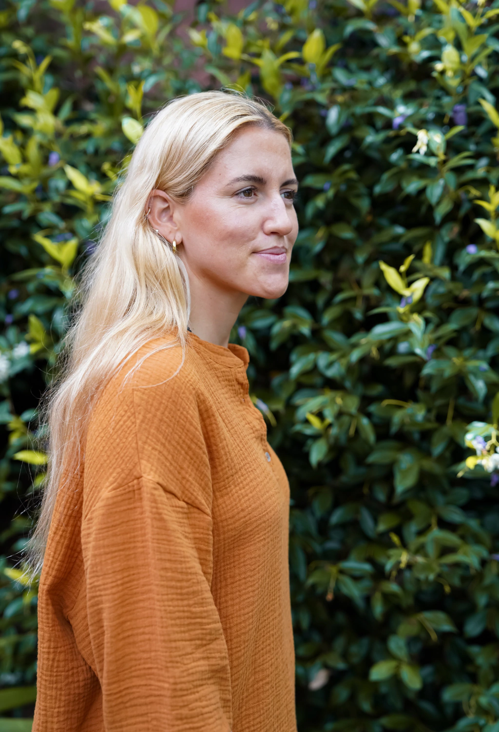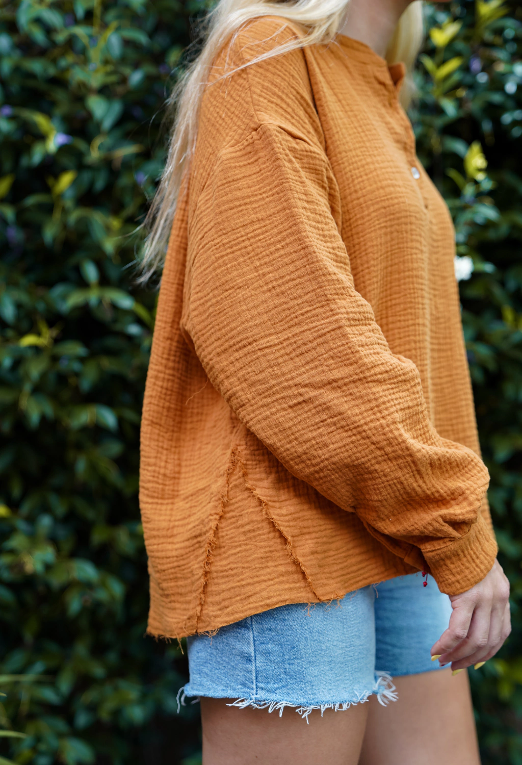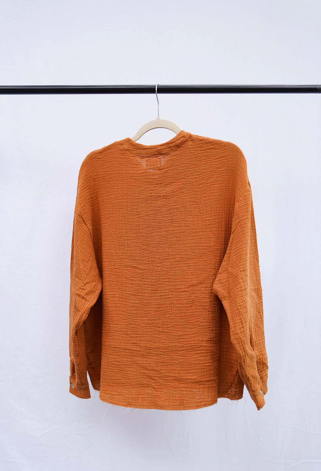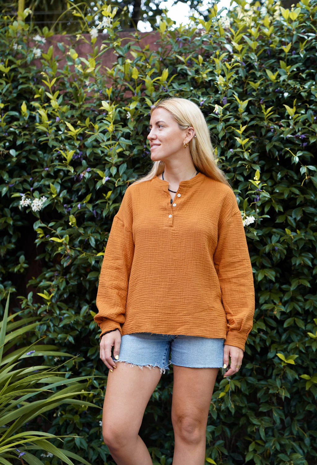 Cuenta con 3 botones de nacar hasta el centro de la camisa, botones de nacar en los puños. Corte irregular de diseño a los costados, y desflecado al final de la camisa. Ideal para cualquier epoca del año!